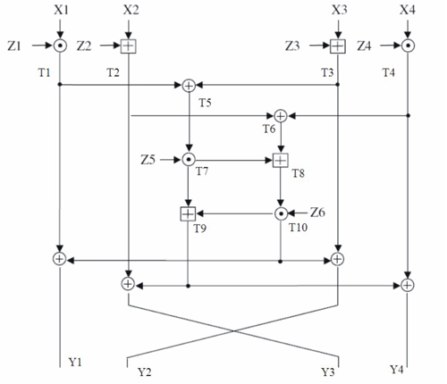 The rounds of IDEA involve complex mathematical operations, which makes it more secured encryption scheme. The figure.2 shows the steps involved in one round of IDEA algorithm.