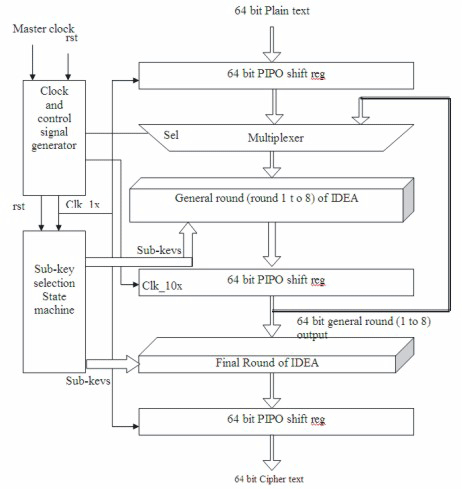 The pipelined implementation is the IDEA architecture which is implemented with a pipeline at every stage output, to improve the performance and hence throughput. The Serial architecture is optimized for area and gives low throughput. The figure 3 gives the serial architecture details.